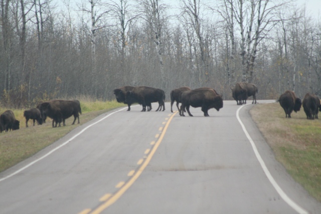 Heute geht’s zunächst in den Elk Island Park. Elk und Moose zeigen sich uns zwar nicht, dafür aber Bisons. Diese blockieren grad die Strasse.