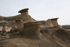 Heute geht’s in die Badlands. Eine eigenartige Landschaft präsentiert sich uns nach Drumheller. Erste Station sind die Hoo Doos. Die durch Erosion geformten Steinkegel ergeben ganz bizarre Gebilde.