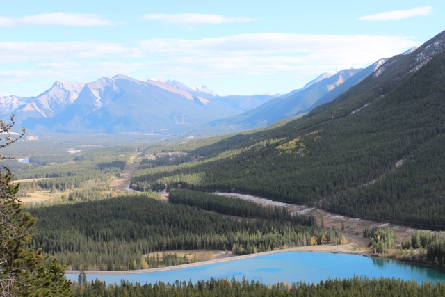 Wir fahren zu den Spray Lakes, die mit dem Auto nur auf diesen besagten Naturstrassen erreichbar sind. Oben angekommen, ergibt sich eine herrliche Sicht über die Rockies, den Bow River und das Örtchen Canmore.