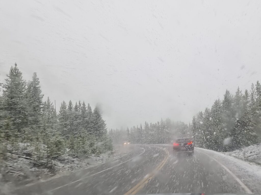 Als wir auf dem 2’700 Meter hohen Dunraven Pass fahren, setzt Schneefall ein, der uns fast bis zum Ausgang des Parks begleitet. In West Yellowstone scheint dann die Sonne, aber auch nur für circa 10 Minuten, dann regnet es schon wieder heftig.