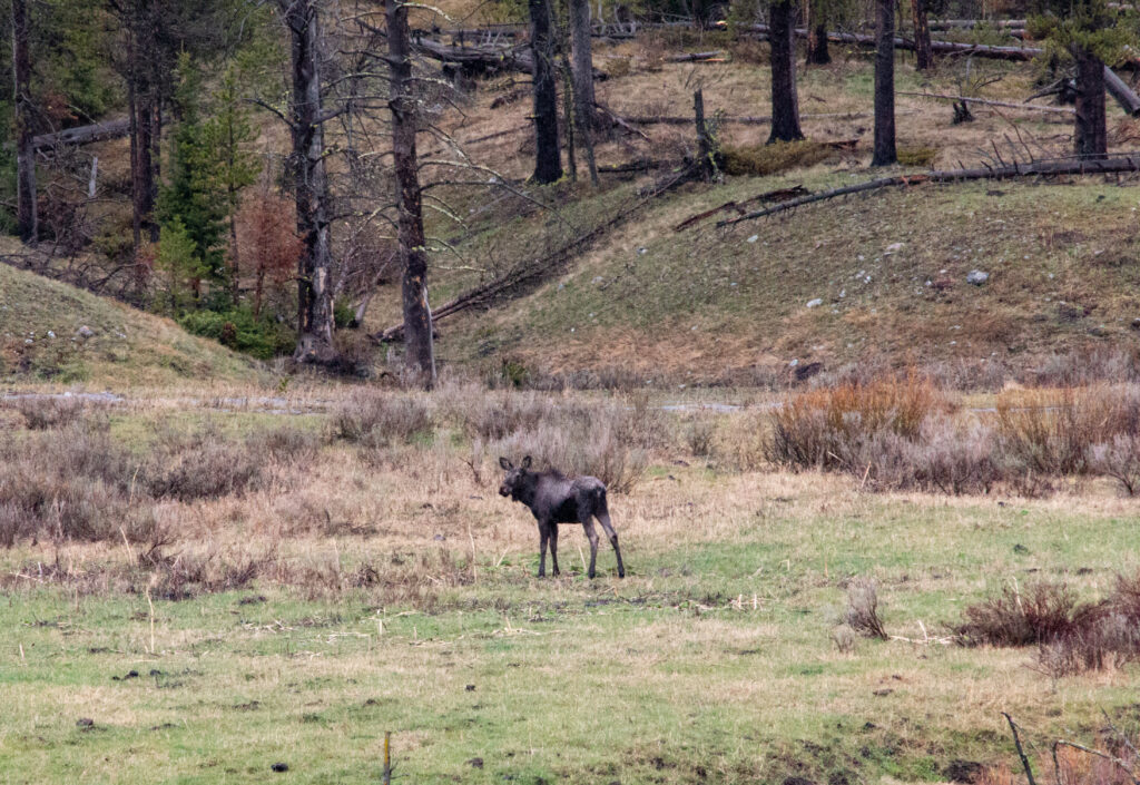 Zwischendurch sehen wir immer wieder Bisons, Goats und Rehe. Auf einer Anhöhe haben sich viele Menschen versammelt und ihre Kameras und Ferngläser gezückt. Mal schauen, was es hier gibt. Oh, ein Moose. Eigentlich zwei, aber das eine hat sich hinter dem Gebüsch versteckt.