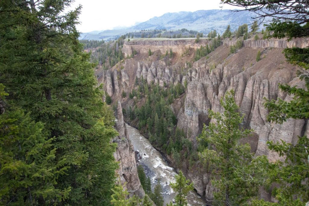 Am Nordost-Eingang kehren wir und fahren zurück nach Tower Roosevelt und von dort nach Canyon Village. Auf diesem Weg schlängelt sich der Yellowstone River durch den Canyon und die Einblicke in den Krater sind gewaltig.