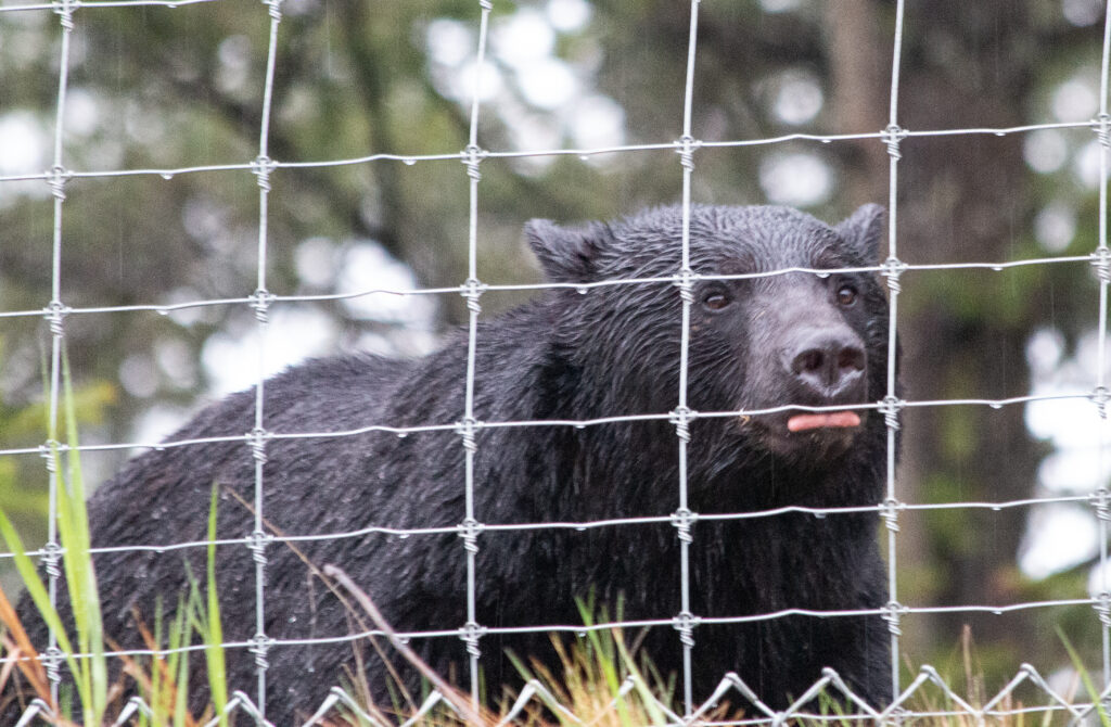 Leider ist auch in diesem Park am Highway teilweise ein Zaun zum Schutz der Tiere gespannt. Das ist für die Fotografen zwar ärgerlich, aber wenigstens gibt es sie doch. Die Bären. Ganz durchnässt ist der Kleine.