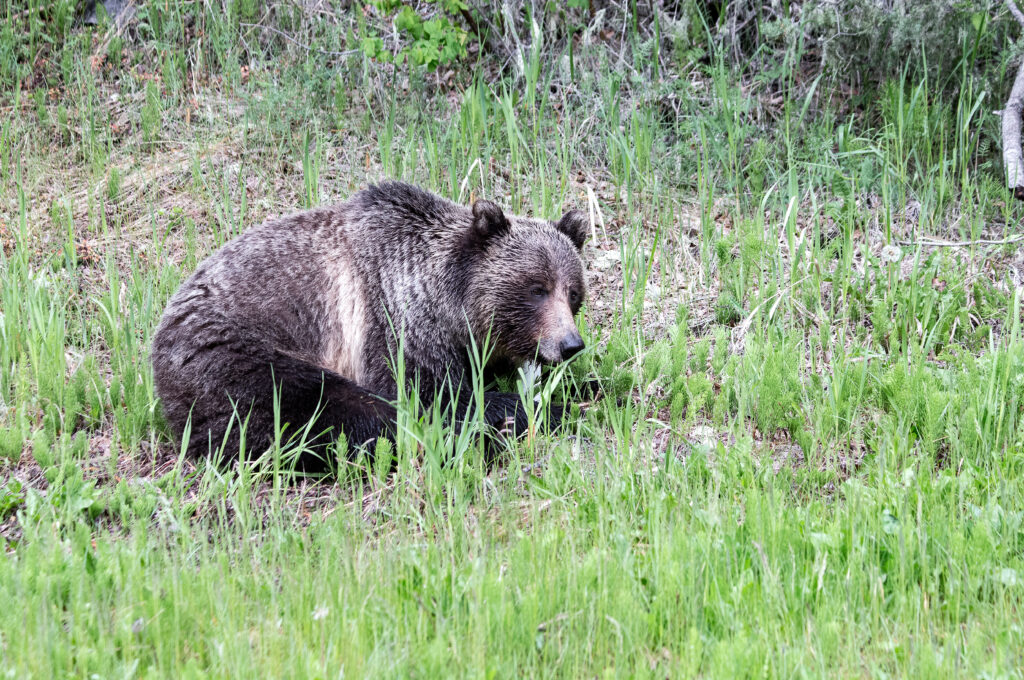 Als wir vor den Toren von Radium Hot Springs, also quasi schon fast aus dem Park herausgefahren sind, sitzt er da. Hockt am Strassenrand, als warte er schon seit drei Tagen auf uns, damit wir ihn fotografieren. Ach, wie schön – manchmal liegen Freude und Trübsinn nah beieinander.