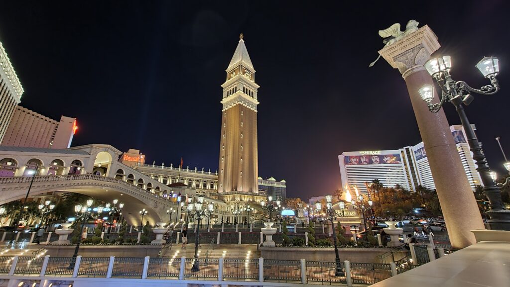Der Strip erstrahlt in seinen blinkenden Lichtern und es ist eine wahre Freude. Im The Palazzo & The Venetian Resort ist – wie der Name sagt – Venedig nachgebaut: die Rialto Brücke, der Marcusplatz und natürlich kann auch eine romantische Gondelfahrt gemacht werden. Als wir vor dem Pool stehen, realisieren wir einmal mehr, was es ausmacht, im richtigen Winkel zu fotografieren. Auf den bekannten Fotos könnte man meinen, der Pool sei riesig, tatsächlich ist er nur ein kleiner Tümpel.